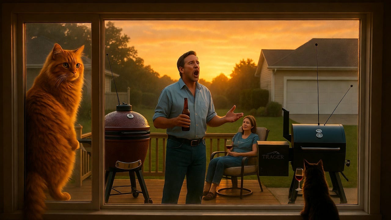 That evening. Patio, beer in hand, staring at the Traeger, the Kamado, and through the garage window, the exiled Sous Vide.